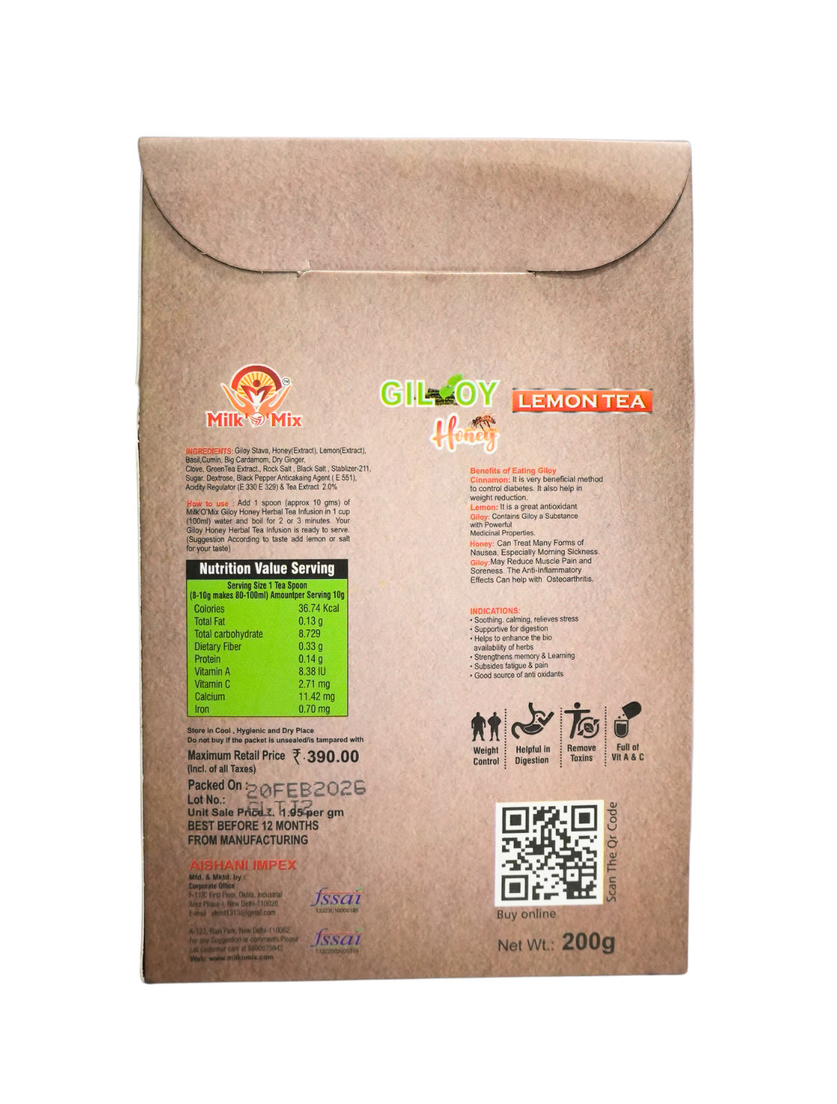 Giloy, Honey, Lemon, Tea (approx. 2.0%), Cinnamon, Mint, Dry Ginger, Clove, and Natural Flavoring Agents