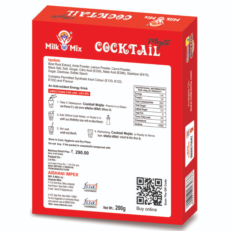 एक गिलास मे 2 बड़े चम्मच काक्टैल मोजिटो प्रीमिक्स ले |