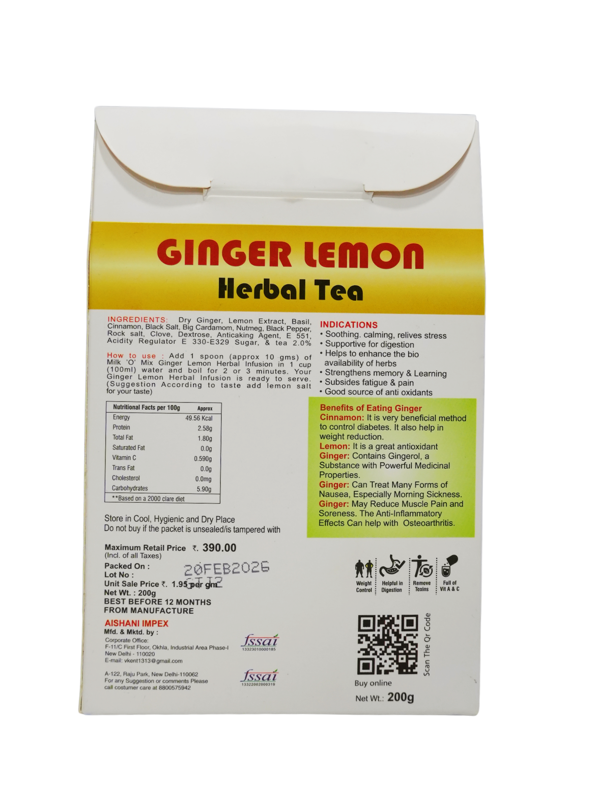 Basil, Cinnamon, Mint, Cumin Seed, Dry Ginger, Rock Salt, Black Cardamom, Clove, Sugar, Lemon & Tea 2.0%