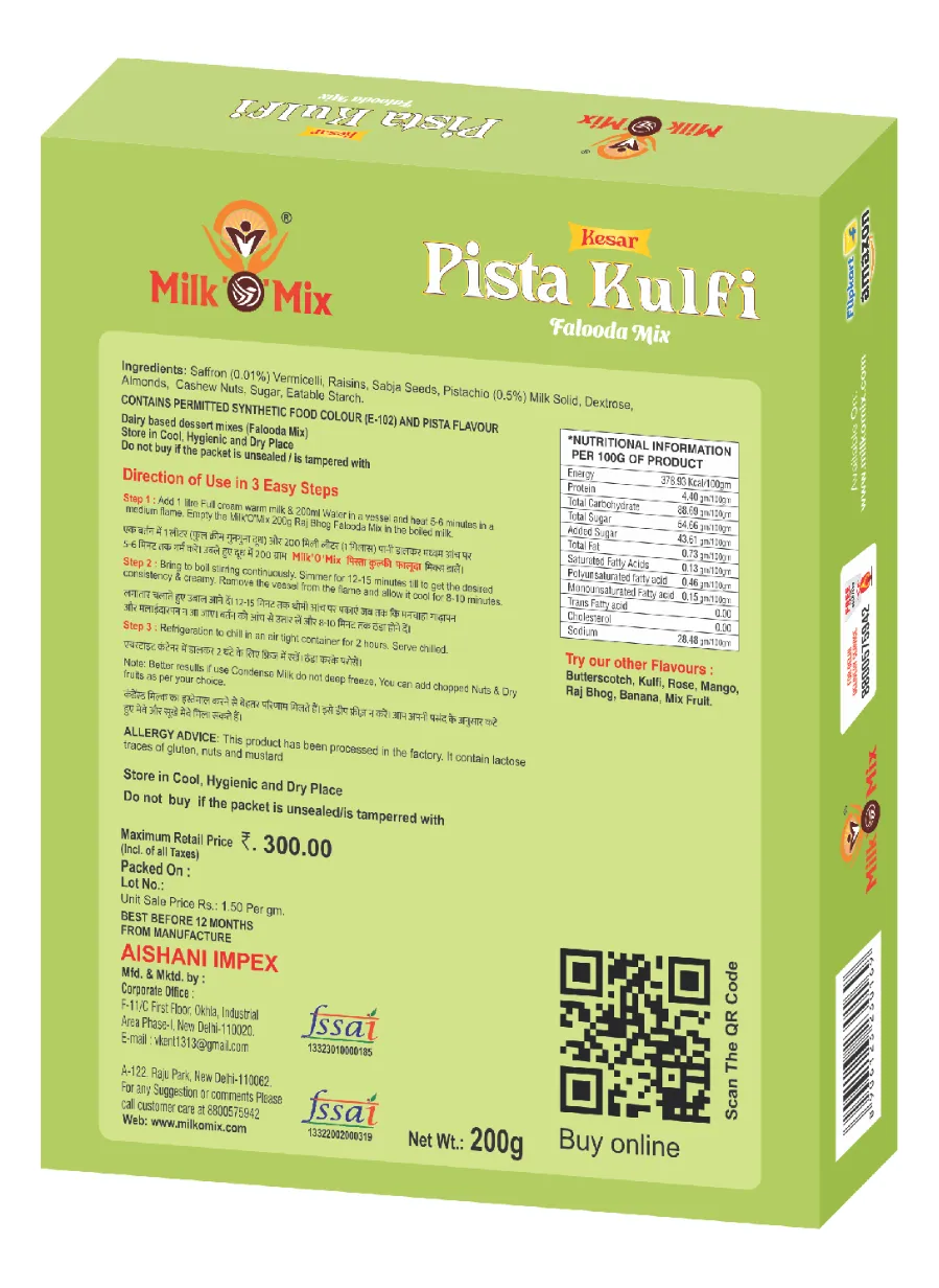 INGREDIENTS: Saffron (0.01%), Dextrose, Vermicelli, Sugar, Almond (3%), Pistachio (0.5%), Eatable Starch, Milk Solid, Raisins, Sabja seeds.