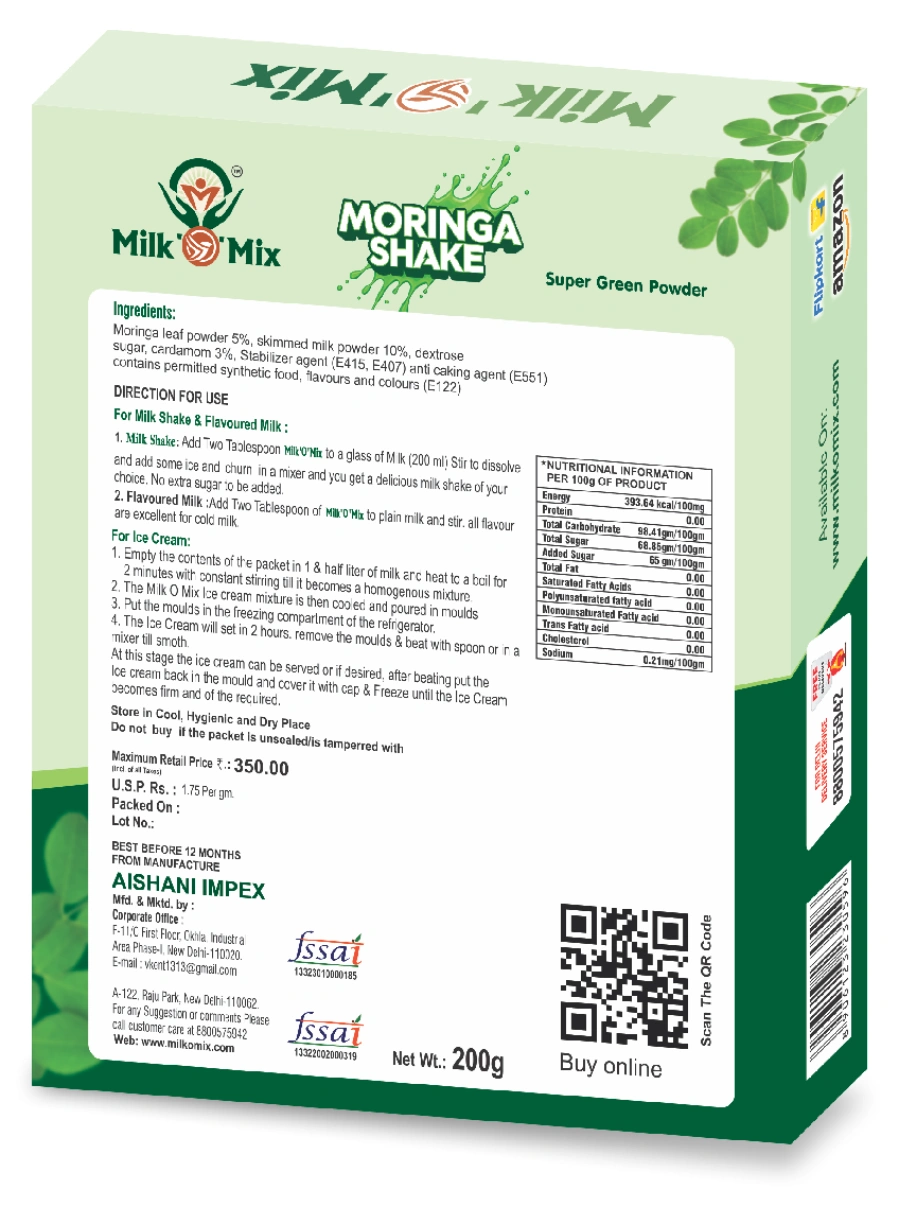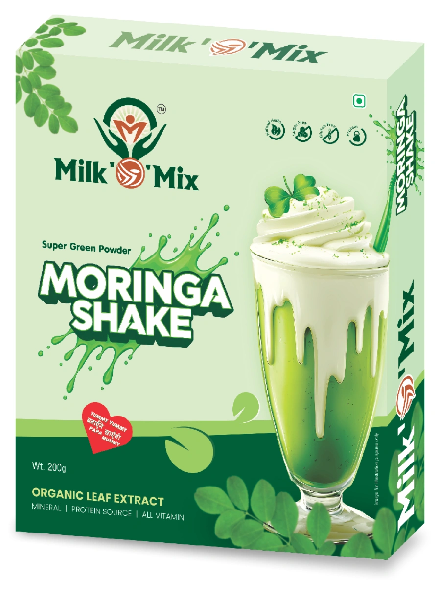 1. Milk Shake: Add two tablespoons MilkOMix Moringa Shake Powder to a glass of Milk (200ml). Stir to dissolve and add some ice and churn in a mixer, and you get a delicious milkshake of your choice—no extra sugar to be added.